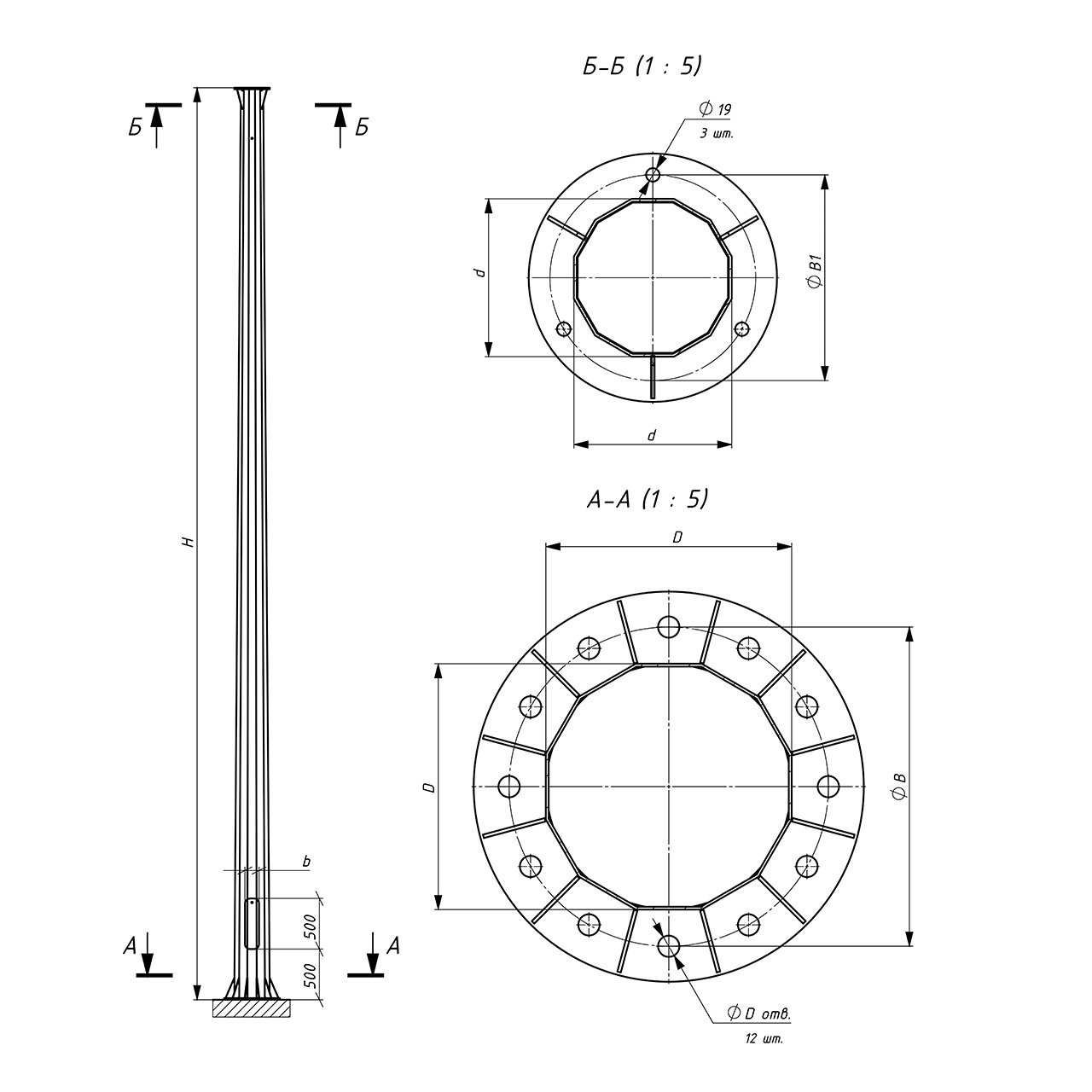 Масса опоры: m=485кг / Расчетная нагрузка: P=1,3т / Размеры опоры: H=11м, d=220мм, D=480мм / Размеры фланца: B=590мм, B1=290мм, Dотв=39мм, nотв=12шт. / Размеры лючка: h=500мм, b=160мм